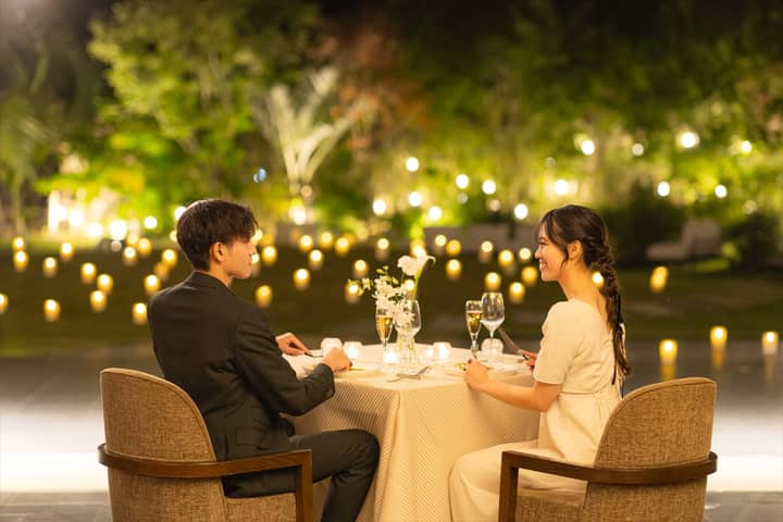 豊かな木々に包まれながら、水のせせらぎを感じるチャペルで、おふたりだけの特別な想い出のひとときを。また、幻想的に煌めくキャンドル演出も可能です。