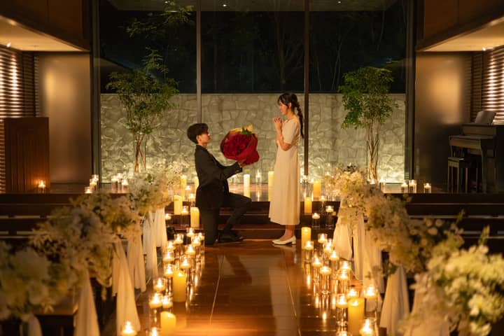 貸切のチャペルでプロポーズ。詳細や流れは事前にしっかりと打ち合わせをさせていただくので、安心して当日をお迎えください。プロポーズの後はチャペルでプロカメラマンによる記念撮影を。おふたりの想い出のムービー上映も可能です。