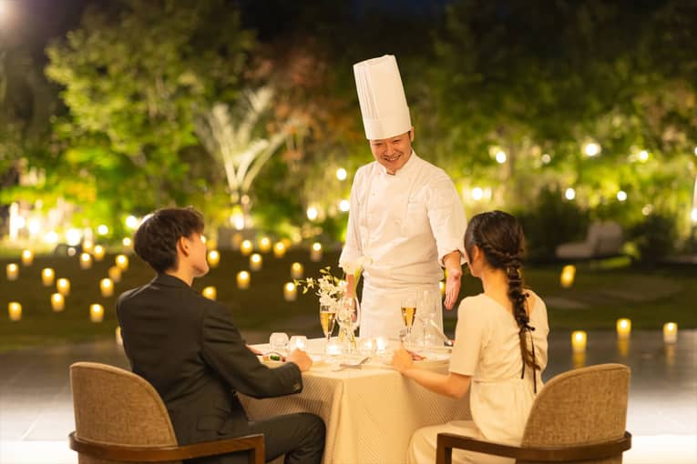 豊かな木々に包まれながら、水のせせらぎを感じるチャペルで、おふたりだけの特別な想い出のひとときを。また、幻想的に煌めくキャンドル演出も可能です。